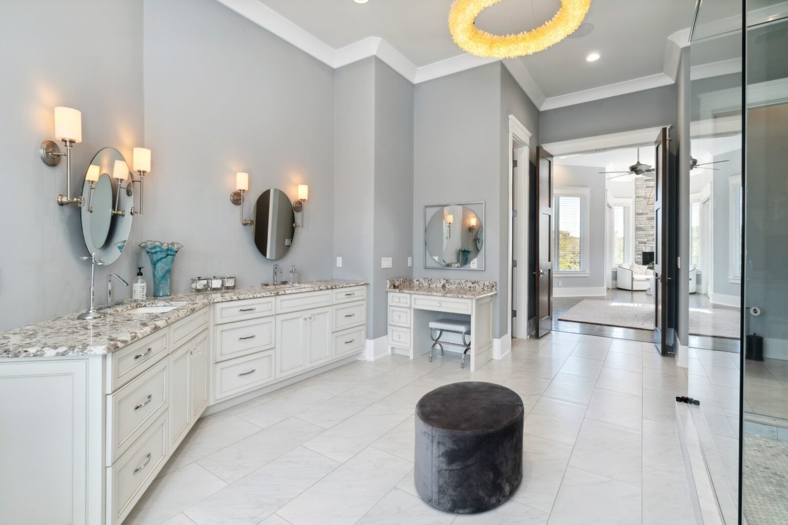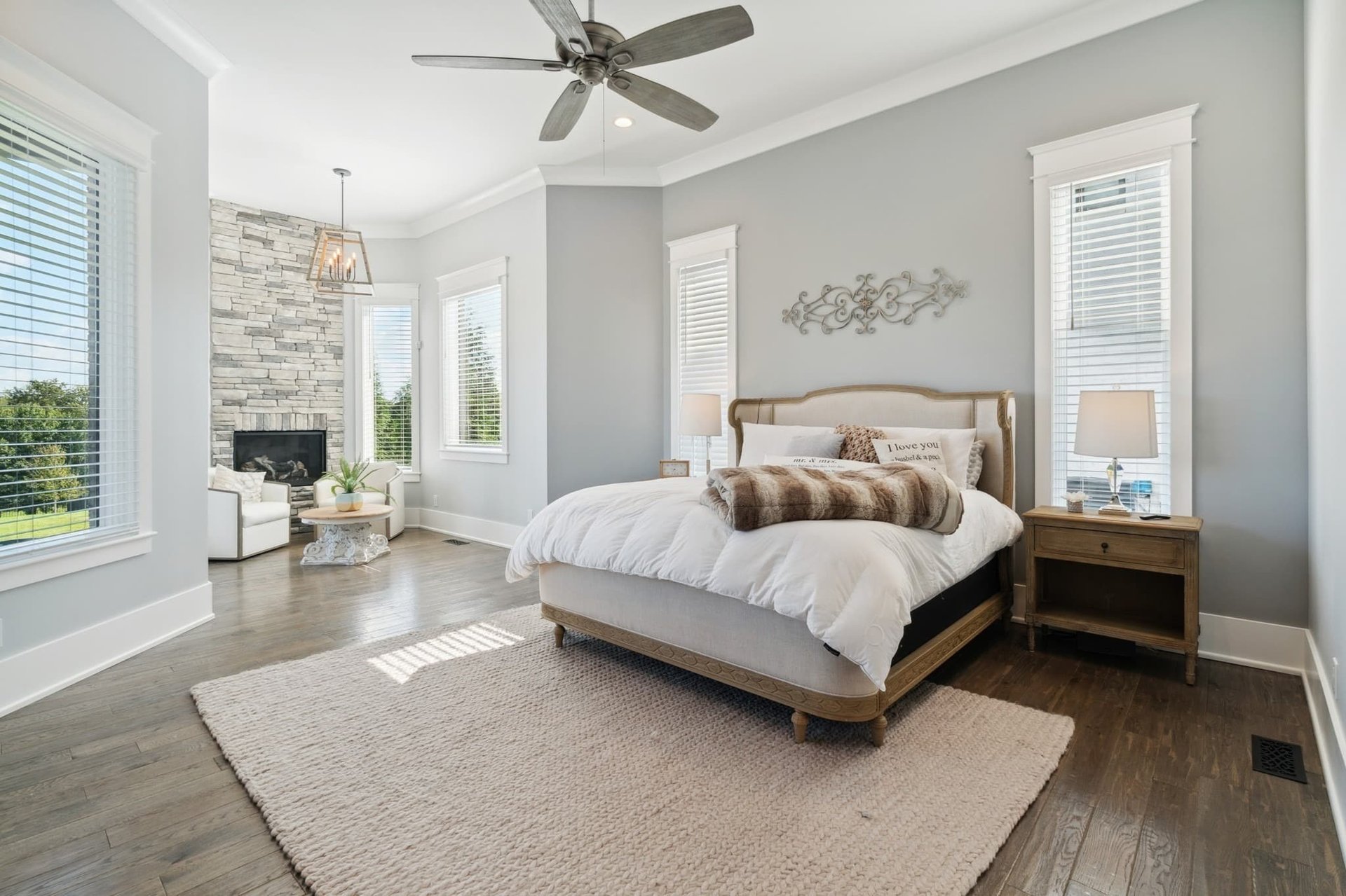 The primary bedroom includes a large room, a gorgeous en suite bathroom, and two walk-in closets. The bedroom includes a sitting area with a fireplace off the side and plenty of room for a king-sized bed.
