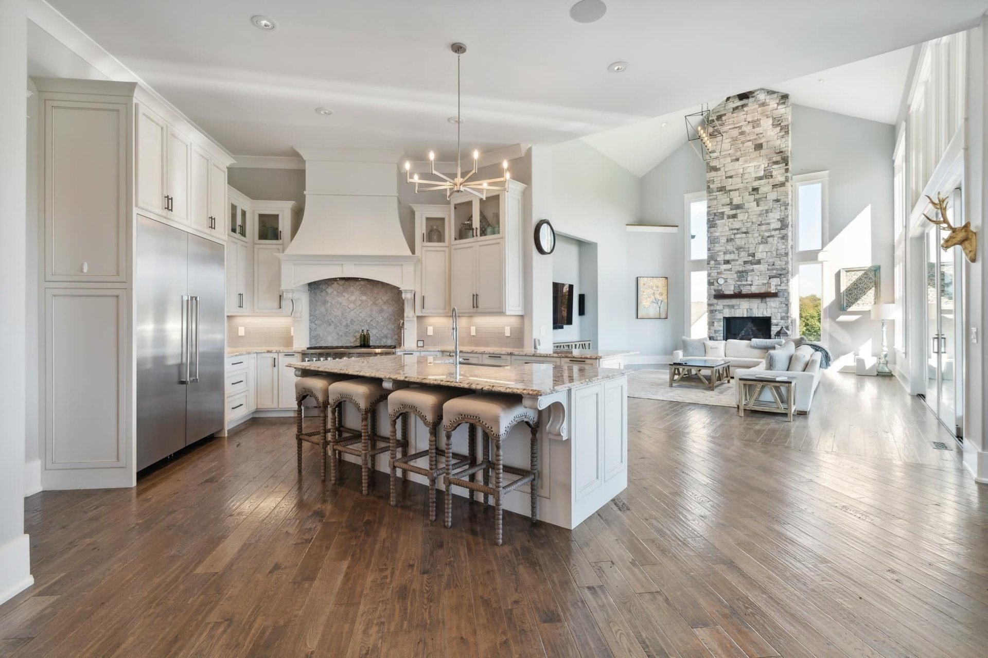 Right when you step into the home, you are greeted with high ceilings, an open floor plan, and lots of natural light. There are windows throughout the home, creating a bright, open space.